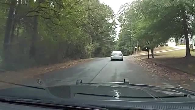 Rear dashcam footage shows the white sub-SUV slowly rolling forward as the woman behind the wheel looks down at her lap, seemingly scrolling through her device in Moscow, Russia. 2025-11-14 18:39:47