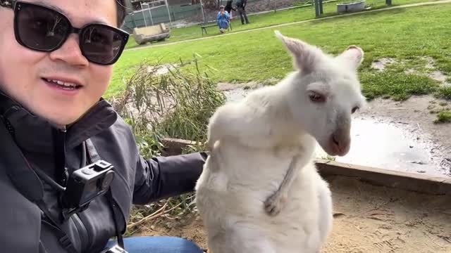 Footage shows the holidaymaker sitting next to the albino joey as it struggles to reach its itchy back with its short paw in Australia. 2025-11-14 13:10:32