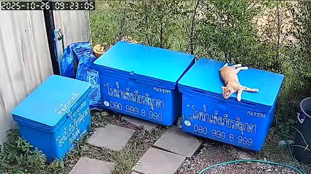 CCTV footage shows the ginger feline lounging on top of the blue chilly bin when a worker carrying a bag of ice opened the cooler in Mukdahan, Thailand. 2025-11-14 13:06:45