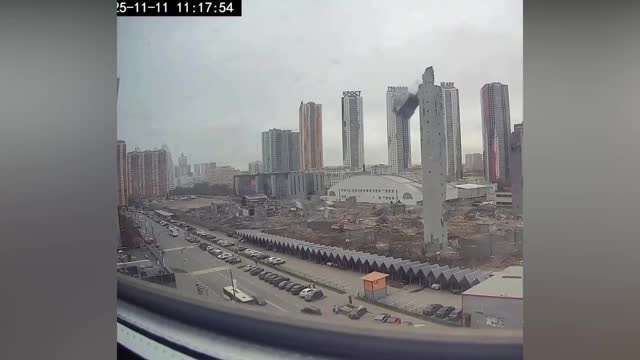 Footage shows part of a large concrete column crashing down during demolition works and exploding into fragments that scatter across the road and nearby parking area in Krasnogorsk, Moscow Region, Russia. 2025-11-14 18:39:37