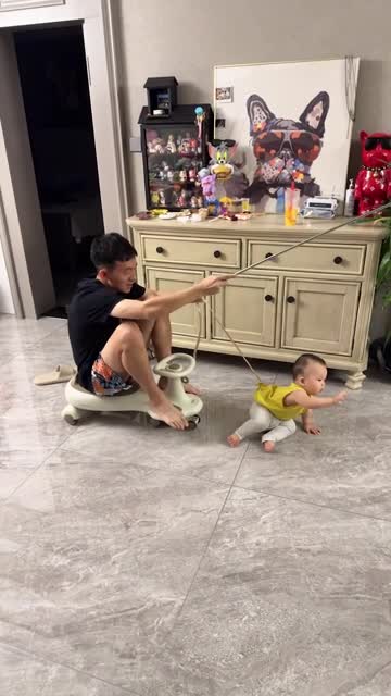 Footage shows Mr Liang riding a plastic ride-on toy car while holding a wooden stick attached to the fruit with one hand, and a rope wrapped around the toddler's shirt with the other, in Liaoning, China. 2025-12-11 14:47:21