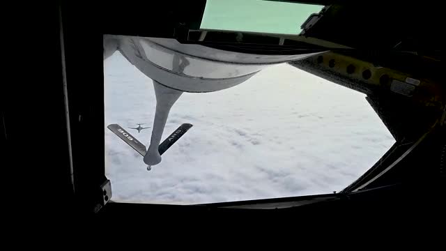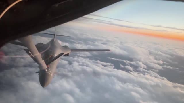 Footage shows a B-1B Lancer from the 9th Expeditionary Bomb Squadron linking up with a KC-135 Stratotanker from the 909th Air Refuelling Squadron during a Bomber Task Force mission on October 20. 2025-12-11 13:56:27