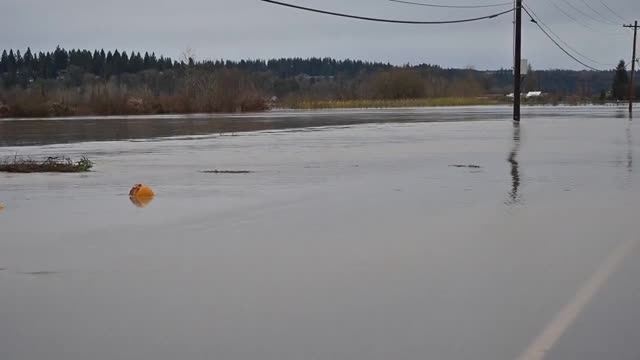 Footage shows two bright orange squash being swept away in the waters as locals stand nearby on Old Snohomish Monroe Road on December 11. 2025-12-17 11:30:37