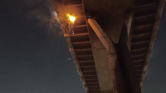 Footage shows the flames burning through polyethylene (PE) pipes on a pier of the Bhumibol Bridge 2 in Samut Prakan province, near Bangkok. 2026-01-20 20:53:37