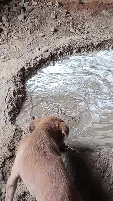 Clever puppy helps owner mix cement