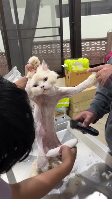 Footage captured by Sky Thanapatt shows Capuchino, the Persian feline, being held by two workers while they gently shave his thick coat in Chiang Mai Province, Thailand.