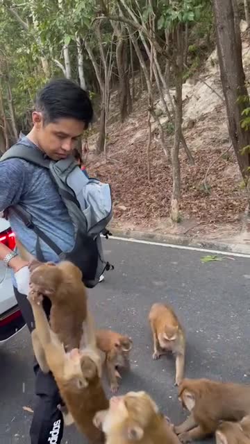Vittaya Pinkaew pulled over his car when he saw the primates to share with them some food in Phuket province, Thailand, on March 11. 2024-03-21 12:32:19