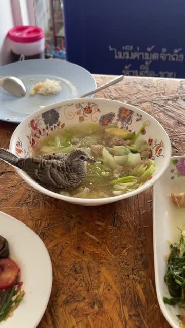 Footage shows the overly comfortable feathered animal perched on the vegetable and chicken soup on the house owner’s table in Maha Sarakham, Thailand, on December 20, 2023. 2024-01-03 18:02:46