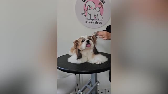 Footage shows the adorable pooch sitting well-behaved on the grooming table while an assistant styled its hurt with a curling iron in Krabi province, Thailand on August 26.
