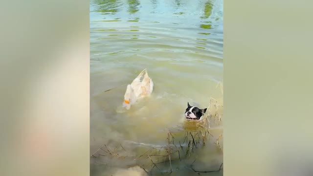 Pet dog and goose play together in pond