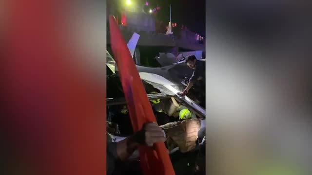 Footage shows the heavy equipment flipping over and falling downhill when it tried to roll off a truck's cargo bed while navigating the Doi Mae Salong hill in Chiang Rai, Thailand, on February 3.