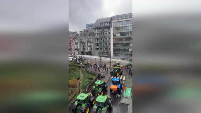 Footage shows a long queue of tractors jamming the road while a firetruck sprayed them with water cannons and tear gas on February 26. 2024-02-29 12:06:54