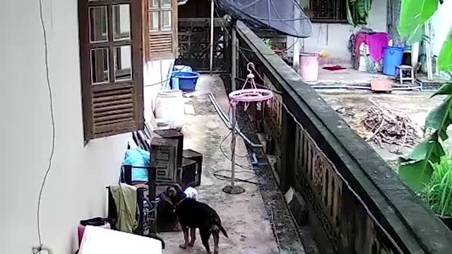 The bird wandered around the dining table when it curiously bit the pooch's rear as it leaned on the table where the kid had been eating in Shandong province, China on April 13. 2024-03-05 21:56:15