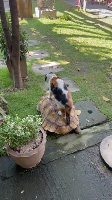 Footage shows the three-year-old Scottish Fold moggy named Tangtang perched on the shell of his friend, a six-year-old sulfate tortoise named Ralph in Chiang Mai, Thailand on March 2. 2024-03-06 08:43:34