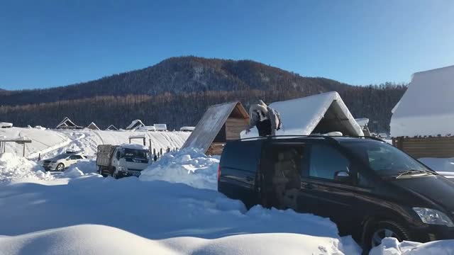 Footage shows the teenager, wearing a grey winter jacket, standing on top of the black vehicle surrounded by deep, accumulated powder in Xinjiang, China. 2025-12-23 14:17:04