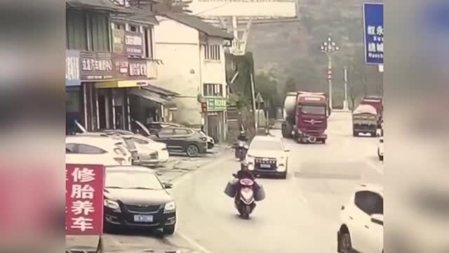 This is the shocking moment a motorcyclist escapes death after a moving lorrystruck him and dragged his bike for dozens of feet along the street. 2024-03-05 13:50:46