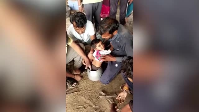 The three-year-old youngster was playing hide-and-seek with other kids when she climbed into the empty kitchen utensil in the village of Betul in Madhya Pradesh, India, on March 3. 2024-03-05 12:55:14