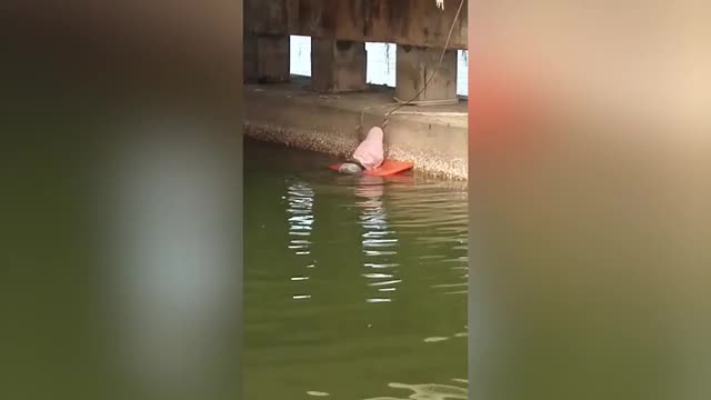 Footage shows the hero resident floating on a paddling board to reach the feline before pushing herself back to shore with the moggy in Nakhon Si Thammarat, Thailand on August 22.