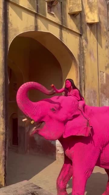 Footage shows an Indian female model, also painted in vibrant pink, sitting atop the elephant, named Chanchal, in Jaipur, Rajasthan. 2026-04-15 21:07:15