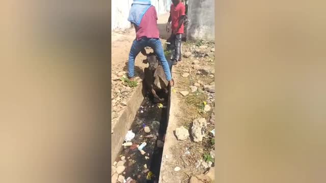 Footage shows Prakash Sen and Ajay Sondhia from the Atal Kamdhenu Gau Sewa Sansthan removing the hapless bovine in Shahdol, Madhya Pradesh. 2026-04-15 17:23:46
