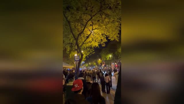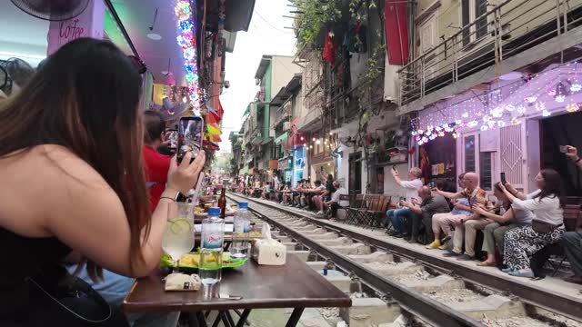 Footage shows holidaymakers sitting alongside the railway tracks, phones raised as they record the approaching locomotive on Hanoi's famous Train Street. 2026-04-15 17:30:46