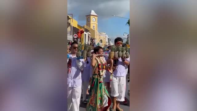 Footage shows the local carrying the tropical fruit on a long skewer stabbed through his cheek during a parade in Phuket island on October 19. 2023-10-23 12:32:04
