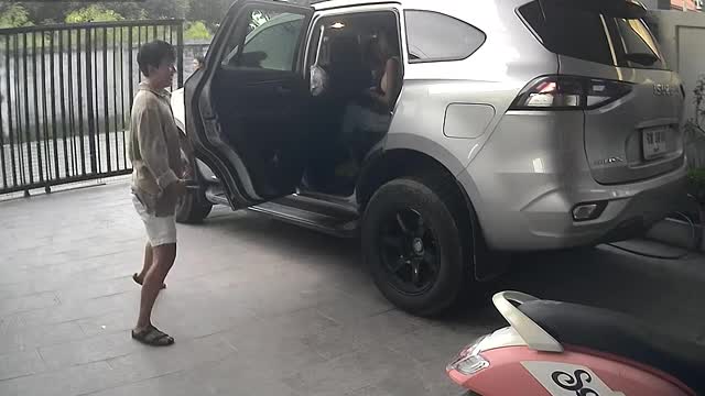 The mother had pushed open the garage gate, but its rollers became stuck on the rail. She lifted the gate up hoping to loosen the obstruction, but ended up knocking over the metal fence. 2023-10-20 14:03:30