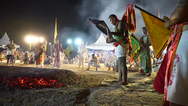 Locals stoked the hot embers with bamboo poles so devotees dressed in white could scamper across the scorching surface on Sunday evening. 2023-10-23 12:29:21