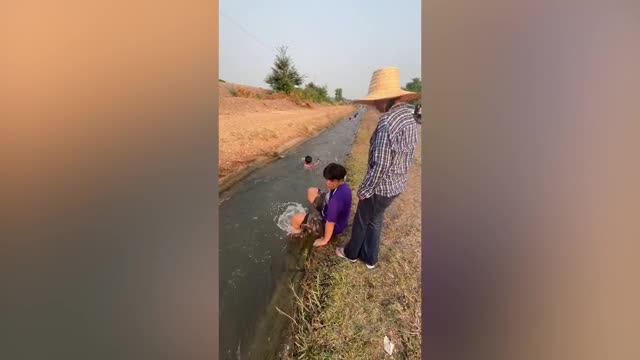 Footage shows the residents jumping into the ditch and surging along with it after the planting season in Kanchanaburi province, Thailand, on April 14. 2023-10-05 18:43:52