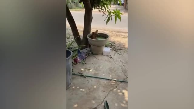 Footage shows the pooch nestled inside the container with tiny aquatic plants covering the surface of the water in Nong Bua Lam Phu, Thailand on April 18 as temperatures reached 42 degrees Celsius. 2023-10-05 18:42:42