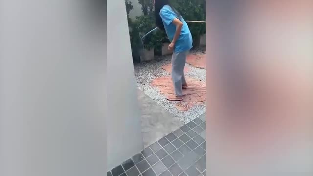 Footage shows the female house owner capturing the serpent into the cleaning tool and dragging it out of a potted bush in Bangkok, Thailand on May 1. 2023-10-05 18:34:17