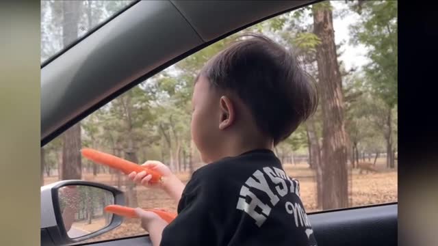 Footage shows the boy ready to hand out two halves of a large carrot as he and his mum drove through a safari park in Qinhuangdao, in northern China's Hebei Province. 2023-10-06 11:47:51