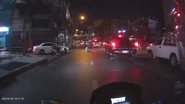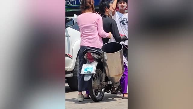 The motorist and his pillion passenger strolled around in a scooter with the ridiculously big accessory in Nakhon Sawan, Thailand, on April 23 during the Songkran festival celebrations. 2023-08-28 23:06:15