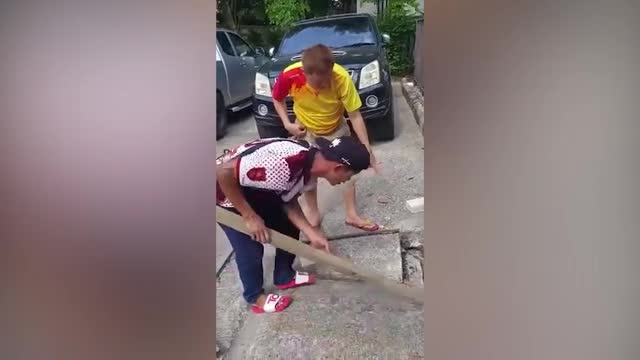 Footage shows the two men waving to oncoming motorists to slow down and crossing to the other side together before carrying the feline to safety in Bangkok, Thailand, on January 23. 2023-08-28 23:04:27