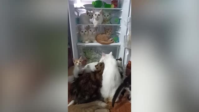 The felines squeezed into the shelves of the appliance when the temperature reached a scorching 39 degrees Celsius in Phitsanulok province, Thailand on April 24. 2023-08-28 23:04:03