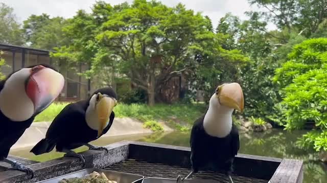 Footage shows the toucan family taking a meal together, with the larger birds handing over scraps of food to the impatient fledglings at the Neo Park Okinawa in Nago, Okinawa. 2023-08-07 16:32:22