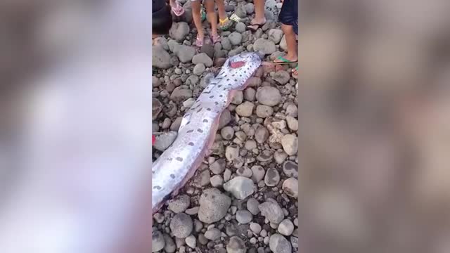 The deep-sea creature measuring around 5ft long was discovered by fishermen lying lifeless on the rocks along the shores of Baybay City, Leyte province, on August 2. 2023-08-07 15:24:54
