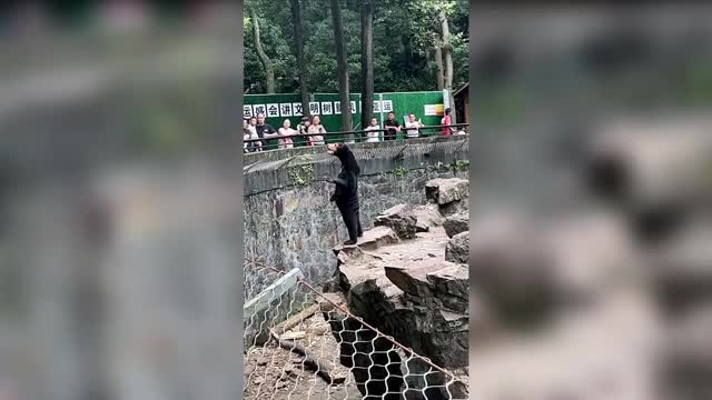 The videos - captured by baffled visitors at Hangzhou Zoo, in Zhejiang Province - shows a sun bear perched up on a tall rock in the middle of its enclosure facing dozens of tourists. 2023-08-02 13:00:16