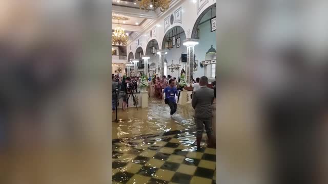 Heartwarming footage shows bride Dianne Victoriano wading through ankle-deep floods with groom Paulo Padilla as they glided along the aisle of the Barasoain Church in Malolos, Bulacan province, looking ethereal in her white wedding gown on July 30. 2023-08-02 14:53:22