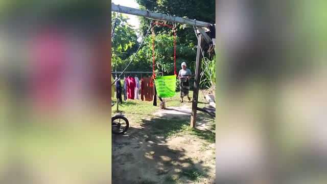 Footage shows the middle-aged man Shamsurizuan Bin Mohamad putting wet clothes in a basket that was tied to a pole in Kota Bharu, Malaysia on June 23. 2023-07-26 21:46:30