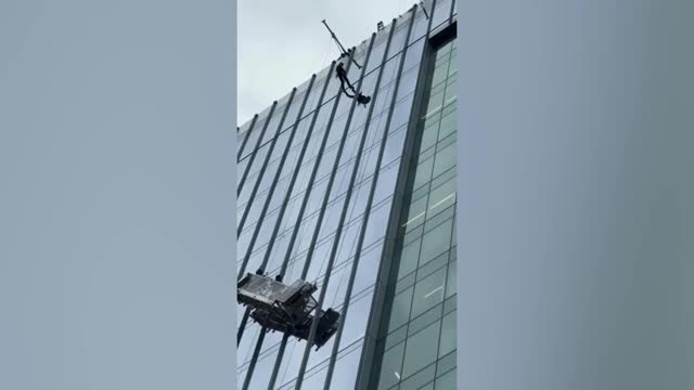 Footage shows the workers suspended in mid-air after their window-washing platform malfunctioned while on duty in Tysons, Virginia. 2025-12-08 21:09:25