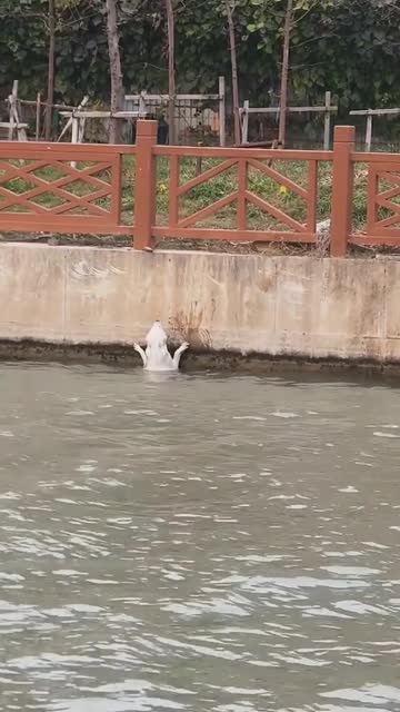 Footage shows a man in a black sweater attempting to save the drowning white pooch, who had become stranded in the water in Shanghai. 2025-12-08 21:17:50