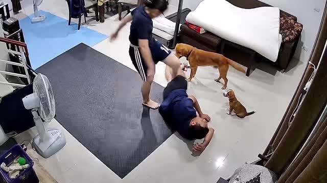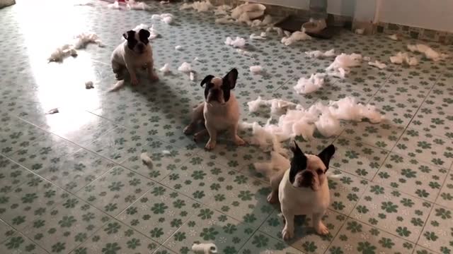 Footage shows the three pooches lined up after being caught playing in the room where the stuffings were scattered in Nakhon Pathom province, Thailand, on May 11. 2023-06-29 18:09:29