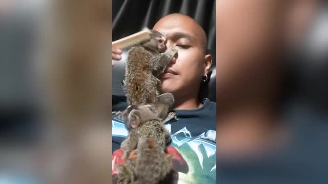 Footage shows the ten-month-old primate Pook Pik clinging onto Teerayut Preecha during the grooming session in their home in Bangkok, Thailand on May 5. 2023-06-29 18:12:30