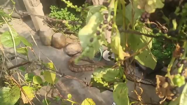 The seven-foot serpents reared their heads and wrestled, toppling baskets and pans as they thrashed around in the property in Ang Thong province on April 7. 2023-04-17 20:30:22