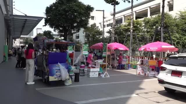 Footage shows food stalls selling barbecued meat, snacks, drinks, and desserts outside the Samyan Mitrtown development compound in the Thailand capital. 2023-03-18 10:49:38