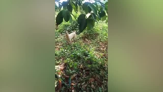 Footage shows the scared pooch Suweena clinging to one of the branches about 10ft above the ground in Sisaket province, Thailand on March 13. 2023-03-17 16:53:10