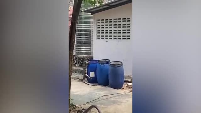 Footage shows the 4ft-long reptile hugging one of the blue containers while crawling upwards in Nakhon Pathom province, Thailand on March 10. 2023-03-17 16:53:05