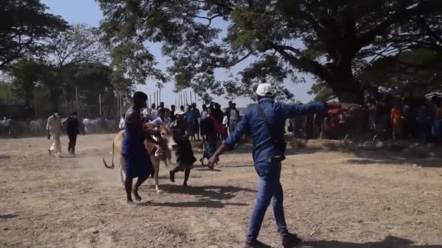 Footage shows dozens of villagers chasing the cows at the Ox-Catching Festival in Kyauktan village, which was about an hour away from Yangon on January 17. 2023-01-23 16:17:59