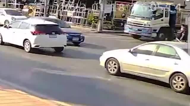 Surveillance footage shows the schoolboy crossing the junction in Bangkok on January 18 at 4:05 pm local time, with the 10-wheeler knocking him down. 2023-01-23 16:49:55
